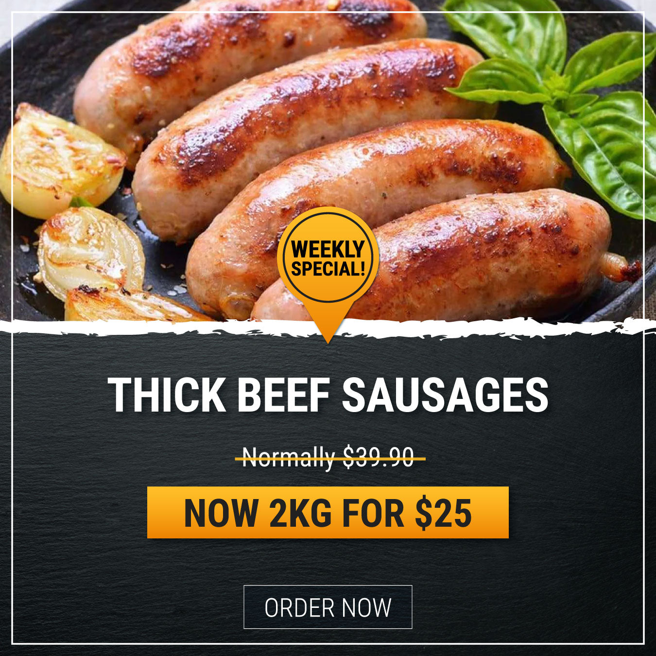 Enjoy the bold, savoury taste of our Thick Beef Sausages, made from premium grass-fed Tova Platinum Angus Beef. Perfectly crafted for your next BBQ, these sausages offer a deliciously juicy and satisfying bite with every mouthful.
